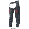 Ladies black rose lined chaps with fringe & braid. Analine Cowhide